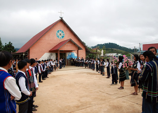 Sáng mùng Ba Tết, vì có người cháu bà con đang sinh hoạt tại giáo xứ LangBiang qua đời nên tôi dành trọn buổi sáng để về với xứ đạo này. Trong những ngày đầu Xuân, bà con giáo dân đi nhà thờ rất đông. Ngôi thánh đường bằng gỗ theo kiến trúc bản địa của giáo xứ cũng được trang hoàng lộng lẫy với cành đào, câu đối Tết và rất nhiều hoa tươi. Sáng mùng Ba, giáo xứ Langbiang cũng cử hành ngày thánh hóa công ăn việc làm một cách rất long trọng. Điều bất ngờ với tôi là sau lễ, sân nhà thờ chật kín người và nhiều loại phương tiện như xe gắn máy, xe đạp điện và cả ô tô con, ô tô tải cùng các loại nông cơ, nông cụ mới mua sắm để cha xứ làm phép. Đây không phải là lần đầu tiên giáo xứ Langbiang thực hiện việc này trong ngày mùng Ba Tết.