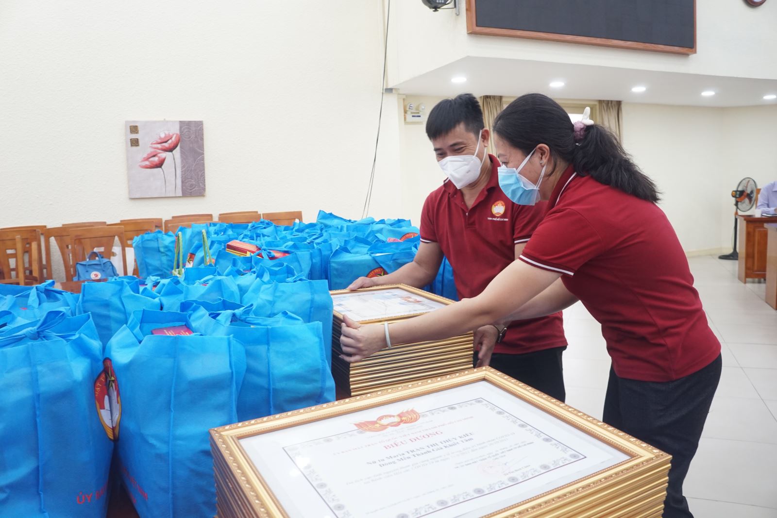 Các chuyên viên ban Dân tộc - Tôn giáo của Ủy ban MTTQVN TPHCM chăm chút từng phần quà, từng tấm bằng tri ân các TNV |