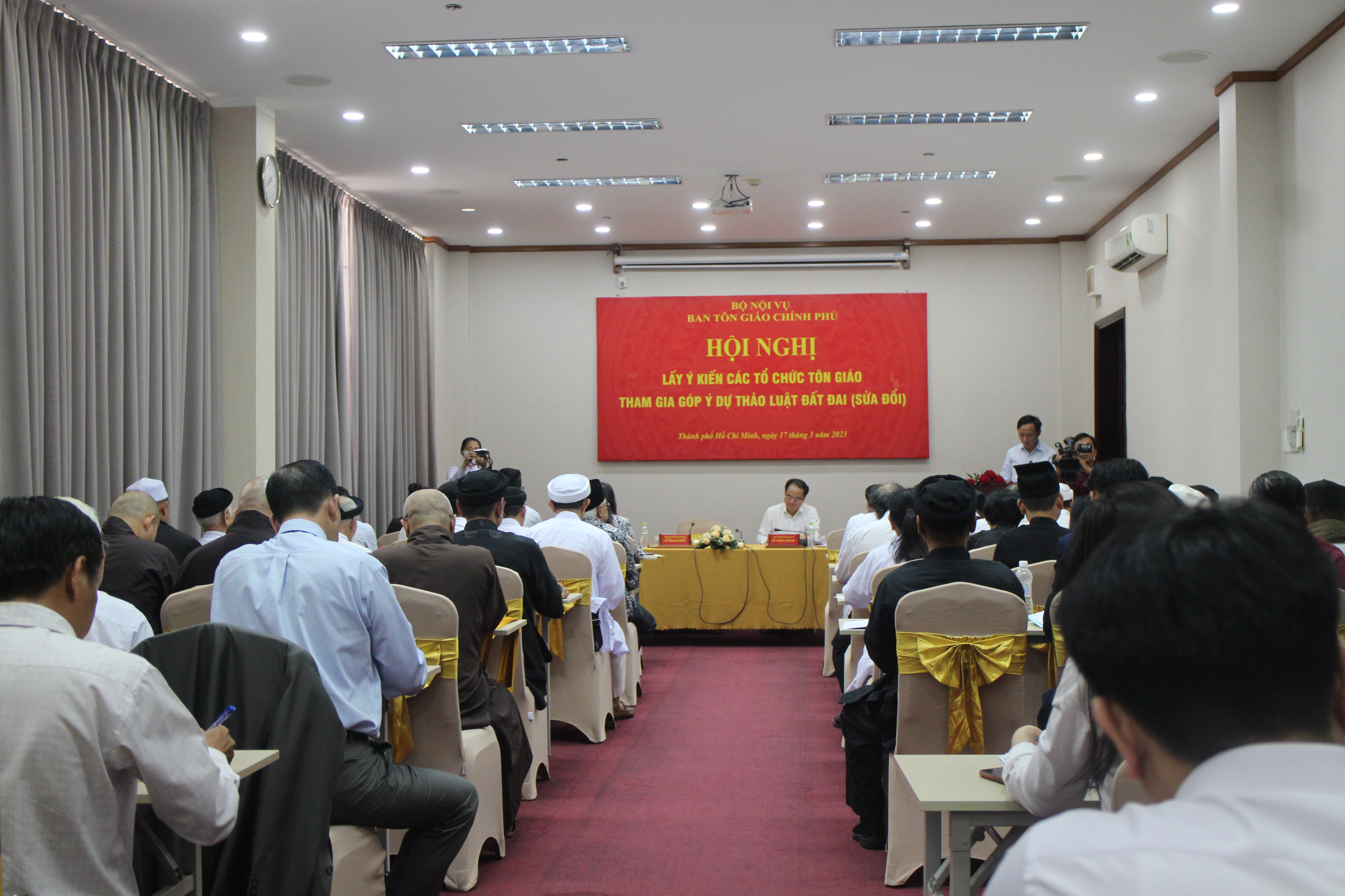 Chiều ngày 17.3.2023, tại TPHCM, Ban Tôn giáo Chính phủ đã tổ chức buổi hội thảo lấy ý kiến góp ý dự thảo Luật Đất đai (sửa đổi) với sự chủ trì của TS. Vũ Chiến Thắng, Thứ trưởng Bộ Nội vụ, cùng một số vị đại diện Ban Tôn giáo Chính phủ. Hiện diện còn có đại biểu các bộ, ngành trung ương. Đại diện các tôn giáo đã tham dự, đóng góp ý kiến theo nội dung mà Ban Tôn giáo Chính phủ đã hướng dẫn tại văn bản số 177/TGCP-VNC ngày 14.2.2023, trên cơ sở thực tiễn việc sử dụng, quản lý, các vướng mắc, tồn tại của Luật Đất đai 2013 liên quan đến việc sử dụng đất của các cơ sở tôn giáo; ngoài ra còn góp ý những vấn đề liên quan đến đất tín ngưỡng, tôn giáo chưa được dự thảo Luật Đất đai đề cập, cũng như một số vấn đề khác đặt ra hiện nay.