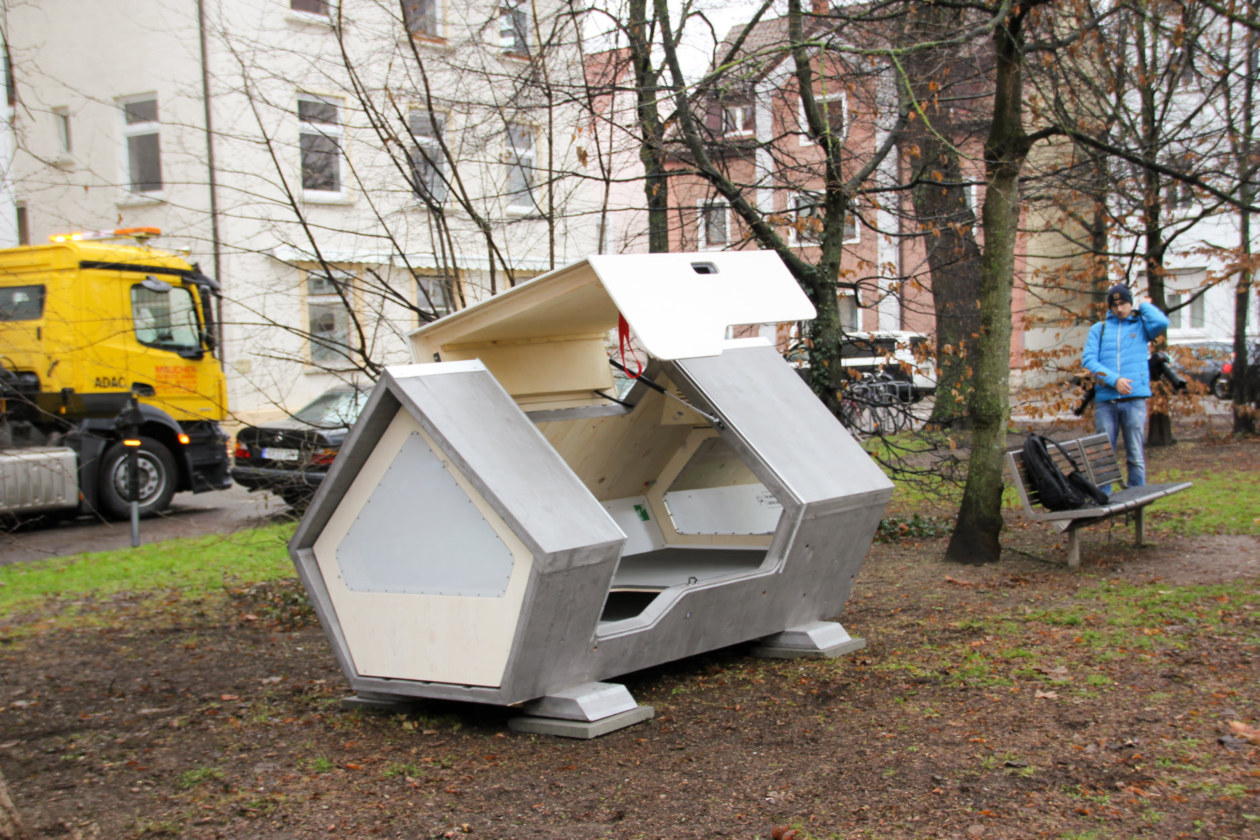 Hệ thống trên được phát triển nhằm phục vụ những người không muốn (hoặc không thể) sử dụng lưu xá chung cho người vô gia cư ở thành phố. Trong quá trình thiết kế, đội ngũ thực hiện do nhà thiết kế Flaco Pross dẫn đầu đã tiến hành khảo sát kỹ lưỡng với mục tiêu xác định đối tượng có thể sử dụng khoang trú. Họ phát hiện nhiều người không thể đi vào lưu xá tập thể vì các lý do, chẳng hạn như không muốn tách khỏi chú chó - bạn đồng hành trung thành, nhưng lưu xá cấm đưa thú nuôi theo; nỗi lo về nguy cơ bạo lực và tội phạm. Sau khi thu thập đủ thông tin, họ xây dựng một nguyên mẫu khoang chứa, với phần thân làm từ gỗ rắn, khung bằng kim loại sơn tĩnh điện. Sau khi khoang được lắp ráp xong, phần gỗ được sơn lớp bảo vệ có thể chịu đựng nhiệt độ lạnh giá của mùa đông nước Ðức. Thiết kế khoang bảo đảm chống cháy và có khóa bảo vệ từ bên trong.