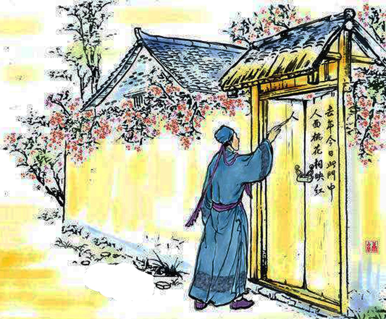 Đây là chuyện Thôi Hộ 崔護 (cuối thế kỷ 8), nhân tiết thanh minh một mình đi chơi về phía nam đô thành, chợt bắt gặp một nhà trồng đầy hoa đào trong vườn. Anh chàng gõ cửa lấy cớ xin nước uống; một cô gái bước ra mở cổng, rồi mau mắn trở vào bưng nước đến mời khách. Cô gái đẹp giữa những hoa đào đẹp làm nhà thơ ngơ ngẩn. Năm sau, cũng vào tiết thanh minh, Thôi Hộ lại theo đường xưa lối cũ tìm đến vườn đào thì chỉ thấy cửa đóng then cài. Thất vọng, gã đa tình bèn lấy bút mực lúc nào cũng mang sẵn bên người rồi ghi vội lên cánh cửa bốn câu bất hủ: