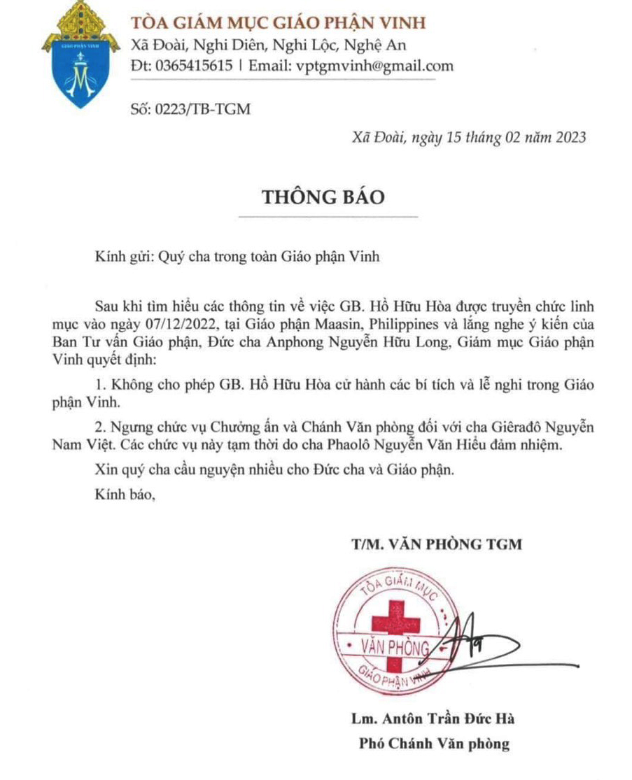 Tiếp theo đó, ngày 15.2.2023, trong văn bản số 223/TB-TGM, Tòa Giám mục GP Vinh đã thông báo, Đức Giám mục giáo phận Anphong Nguyễn Hữu Long đã quyết định ngưng chức vụ Chưởng ấn và Chánh Văn phòng của linh mục Giêrađô Nguyễn Nam Việt - người có mặt và đọc Thư Ủy Nhiệm (nghi vấn bị làm giả do ĐGM GP Vinh đã minh định không ký và gởi thư này) trong lễ truyền chức linh mục cho người giáo dân kể trên, cũng như không cho phép người được truyền chức linh mục đang có sự nghi vấn về tính hợp pháp này được cử hành các Bí tích và lễ nghi trong giáo phận Vinh.
