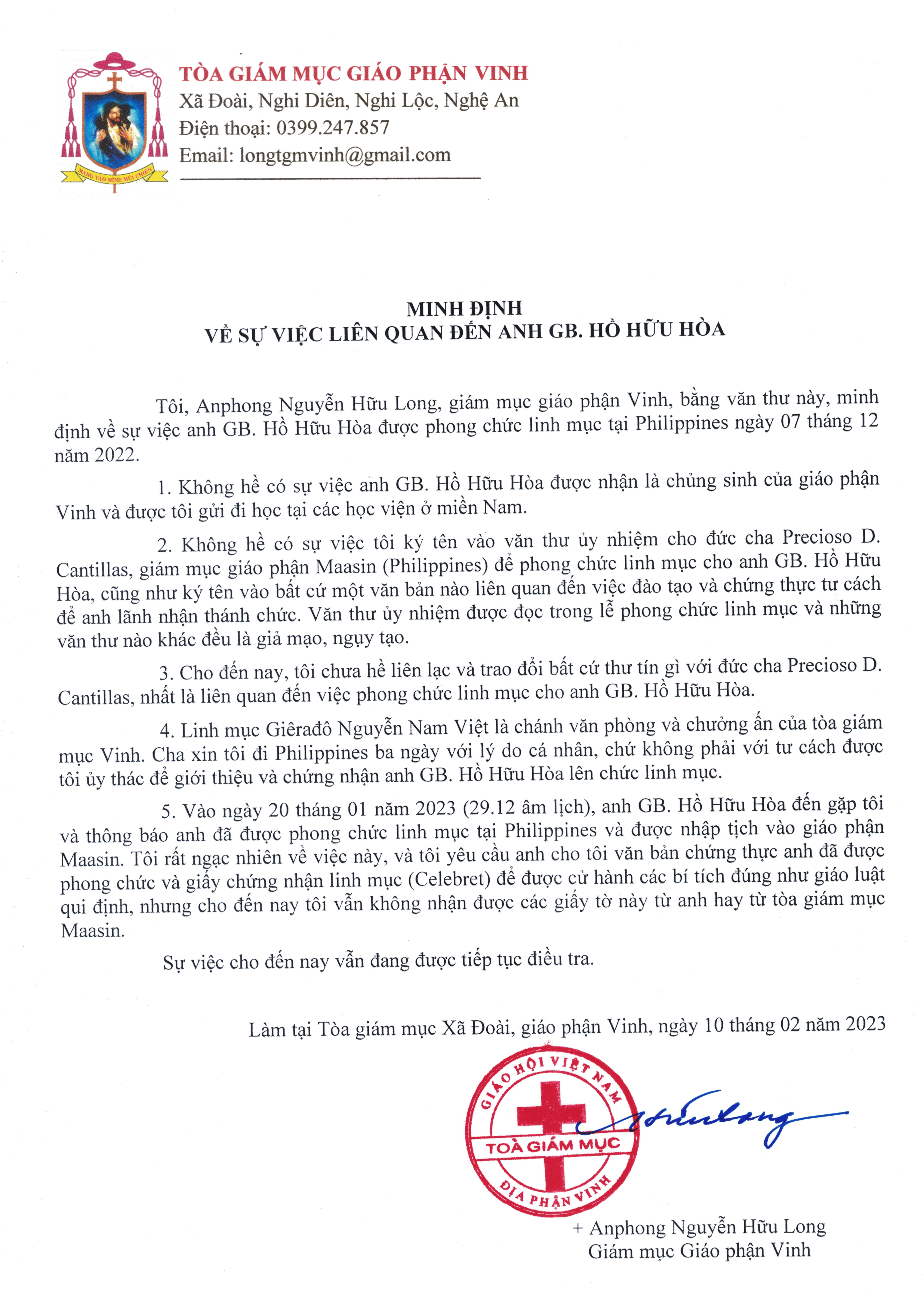 Ngày 10.2.2023, Tòa Giám mục giáo phận Vinh đã ra thông báo của Đức Giám mục giáo phận Anphong Nguyễn Hữu Long, minh định rằng, không có việc người này được nhận là chủng sinh GP Vinh, cũng không được ngài gởi đi học tại các học viện ở miền Nam, và cũng “Không hề có sự việc tôi ký tên vào văn thư ủy nhiệm cho Đức cha Precioso D.Cantillas, giám mục giáo phận Maasin (Philippines) để phong chức linh mục cho anh (…)” (xin xem toàn văn thông báo minh định sự việc đăng kèm).