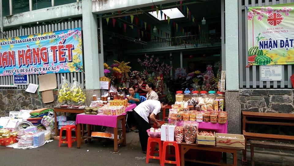 Cũng nhằm gây quỹ từ thiện giúp trẻ mồ côi, người nghèo trong và ngoài xứ, các thành viên trong Ban Caritas giáo xứ Vinh Sơn 6 (hạt Chí Hòa, TGP TPHCM) đã thay phiên nhau phục vụ gian hàng Tết tại giáo xứ từ ngày 9 - 27.1.2017 (12 - 30 tháng Chạp). Đây là lần thứ 7 Caritas giáo xứ thực hiện hoạt động này, số lợi nhuận dùng vào việc bác ái khoảng 30 - 40 triệu đồng/năm. (TIẾU HOA)