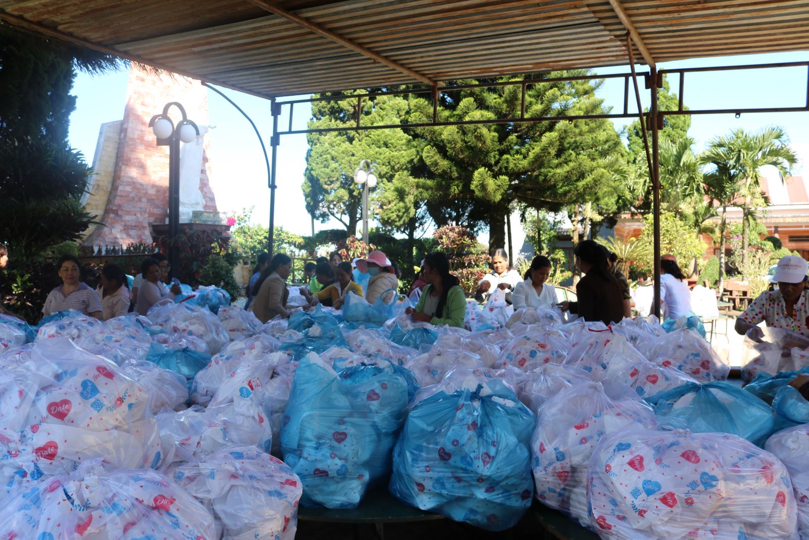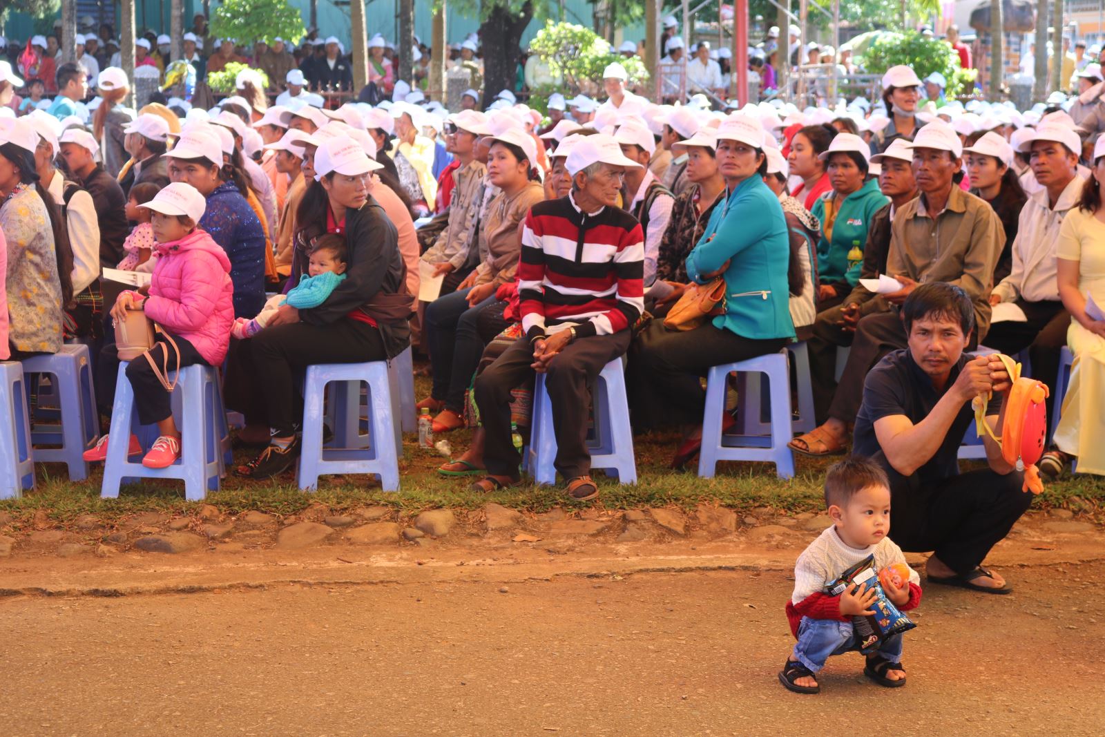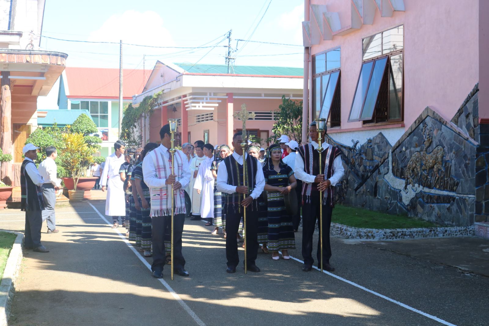Trời còn rất sớm nhưng trên các ngả đường, bà con đã nhộn nhịp hướng về nhà thờ. Tiếng nói, cười, gọi nhau rôm rả xua tan đi cái se lạnh của miền cao trong buổi đầu ngày. Trên lưng mẹ, những đôi mắt thơ ngây xoe tròn nhìn xung quanh như bị thu hút bởi bầu khí nhộn nhịp ít gặp. Họ dừng mọi công việc để họp mặt cùng nhau trong ngày hội “lâu lâu mới có một lần”, như lời chia sẻ của chị K’Khẩn. Ban Tổ chức ước tính có hơn 4.000 giáo hữu người dân tộc thiểu số đến từ các xứ đạo Minh Rồng, B’Sumrăc, Tân Bùi, Đại Lộc, Đà Tồn…
