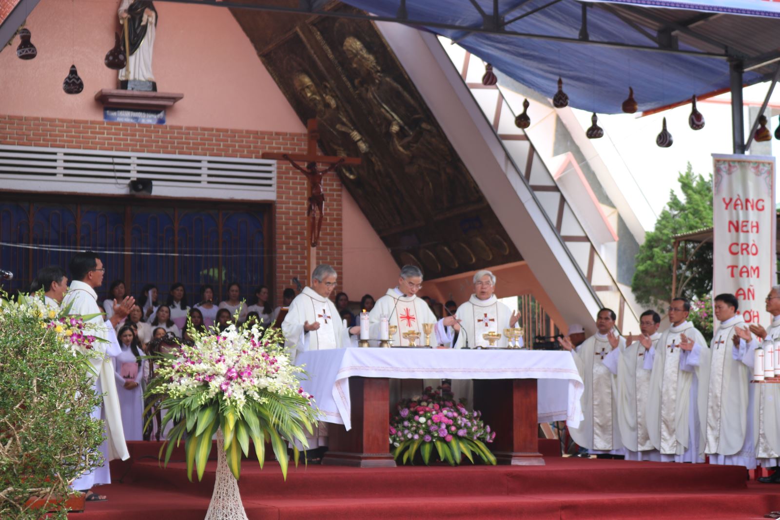 Tiếng chiêng dập dìu vang lên theo nhịp tay đều đặn của các nữ tín hữu sắc tộc dẫn đoàn đồng tế tiến về lễ đài chính. Đức cha Đaminh Nguyễn Văn Mạnh, Giám mục phó Đà Lạt chủ tế thánh lễ cùng các linh mục, tu sĩ, giáo dân trong hạt. Qua 3 bài đọc trong Kinh Thánh, Đức cha chia sẻ về công cuộc truyền giáo và kêu gọi cộng đoàn đi loan báo Tin Mừng cho cộng đồng, nhất là những người sống xung quanh bằng chính đời sống thường nhật của mình. Ngài nêu lên những mẫu gương sống của các thánh tử đạo Việt Nam với mong muốn sẽ “thúc đẩy mỗi người nghĩ lại trong đời sống hằng ngày, ngoài việc lo cơm ăn áo mặc, còn phải làm cho đức bác ái vượt ra ngoài bầu khí gia đình, để từ đó sống chứng nhân cho Chúa cách mạnh mẽ hơn”. Trong phần kết lễ, vị chủ tế mời tất cả các Kitô hữu cầu nguyện để có nhiều linh mục say mê với công việc được sai đi.