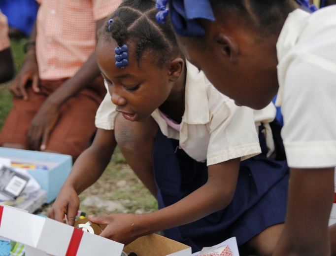 Alcide Wilson cầm trên tay những khối xếp hình, khuôn mặt thoáng bối rối. Đây là một phần trong “hộp quà niềm vui” mà cậu học sinh 14 tuổi tại một ngôi trường ở tây nam Haiti nhận được từ Mỹ.
