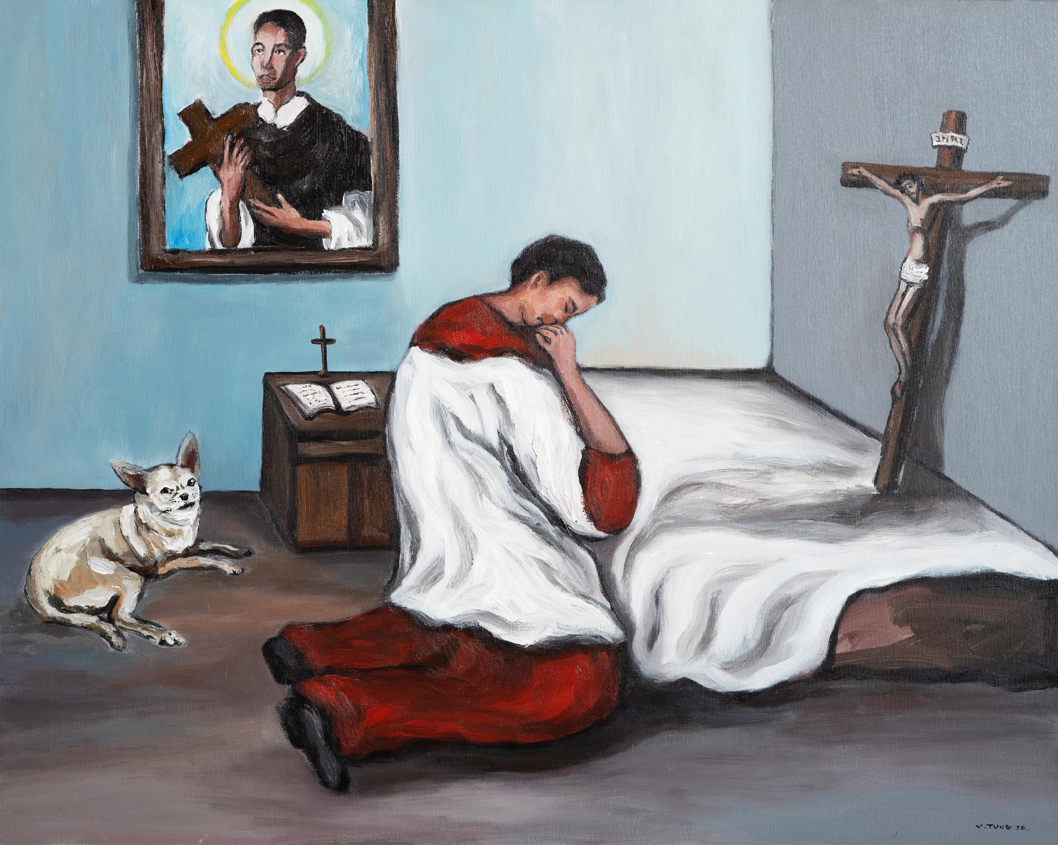 Một biểu tượng suy niệm chính của Kitô giáo không thể thiếu gần như trong toàn bộ Cậu bé giúp lễ là thập tự giá - dấu chỉ của sự cứu chuộc, và là dấu chỉ đức tin của người Công giáo. Đây cũng là dấu chỉ về con đường kêu gọi sống đời tận hiến, con đường thánh giá trở thành con đường sống, được tìm thấy trong sự phục vụ Chúa tức là phục vụ tha nhân. Công việc phục vụ thầm lặng của các cậu bé giúp lễ đã được họa sĩ phát biểu ngắn gọn cho cuộc triển lãm. Phục vụ vì Chúa cũng là hy sinh, là quên mình, không đòi đền đáp, như lời trong Phúc Âm: “Con Người đến không phải để được người ta phục vụ, nhưng là để phục vụ và hiến mạng sống làm giá chuộc muôn người”.