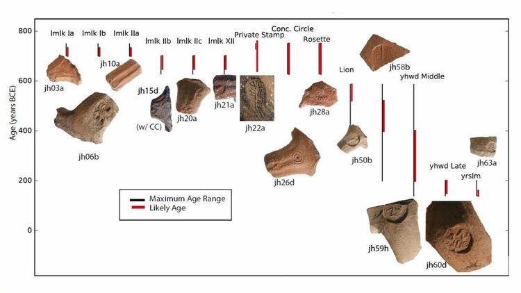 Trong suốt 6 thế kỷ từ trường ghi dấu ấn trên những đồ tạo tác này, các kiểu chữ và nội dung của chúng thay đổi theo thời gian, cho phép người đời sau biết được dấu hiệu nào thuộc về đời vua nào. Những sự thay đổi đó, cùng với lịch sử Israel cổ vốn được ghi chép cẩn thận, đã được so sánh, đối chiếu để đưa ra niên đại cụ thể nhất cho từng món cổ vật, theo các chuyên gia. Chẳng hạn, nhóm đồ vật vào thời vua Hezekiah có chữ Do Thái LMLK, được diễn dịch có nghĩa là “thuộc về nhà vua”. |