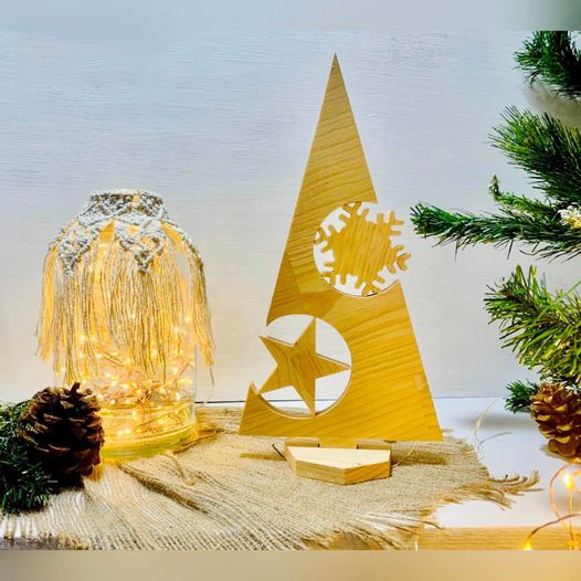 Cây thông làm từ một loại gỗ ép công nghiệp, được trang trí đơn giản bằng một bông tuyết và ngôi sao. Việc chế tác thủ công không được hoàn hảo cho lắm, có thể do sự khó tính của tôi, nhưng nói cho cùng, nó là một tác phẩm đẹp.