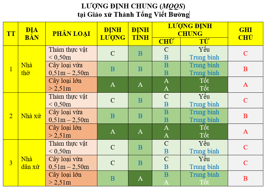 Theo khảo cứu này, mảng xanh trên địa bàn họ đạo Tống Viết Bường hiện thời như sau: thảm thực vật cao dưới 0,5m (kém xanh, thưa lá) là yếu, trung bình; cây loại vừa 0,5 - 2,5m (kém xanh, thưa lá) là yếu, trung bình; cây loại lớn trên 2,51m (xanh rậm, lá tốt) là trung bình, tốt.