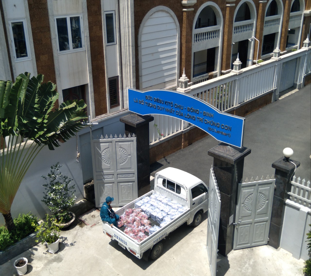 Nhớ lại một ấn tượng khó quên khi lo liệu cung ứng nguyên liệu cho Bếp Tu sĩ, ông Liêm bồi hồi: “Trong thời giãn cách, việc các nhà cung cấp thực phẩm và vật tư giao đến tận nơi cho Bếp Tu sĩ là một vấn đế nan giải vì có nhiều nhà cung cấp các mặt hàng khác nhau. Chúng tôi phải tập trung tất cả vào một nơi sau đó dùng xe tải nhỏ phân phối từng ‘tổng phần’ cho mỗi bếp. Như vậy, thường thì chúng tôi dùng 2 xe để phân phối cho 12 bếp ăn. Các thầy Ðại Chủng sinh đang làm việc này một cách suôn sẻ thì một ngày nọ, cha Giuse Ðào Nguyên Vũ - Ðại diện Tòa Tổng Giám mục trong các chương trình cứu trợ và chống dịch của TGP - báo: ‘Hôm nay chưa xin được giấy đi đường nên phải nhờ bên chùa Vĩnh Nghiêm chuyển hàng cho mình!’. Khá bất ngờ, tôi quan sát trên hệ thống máy quay an ninh, thì thấy cả chục chiếc xe du lịch lần lượt từng chiếc một vào kho để nhận hàng, vì sức chứa mỗi chiếc chỉ nhận được hàng của một bếp thôi. Ðây là xe tư nhân tham gia thiện nguyện với nhà chùa. Mấy chiếc xe tải nhỏ mà cha Vũ sử dụng cho các thầy đi giao hàng cũng là xe chở nhạc cụ của một doanh nghiệp Công giáo làm thiện nguyện. Qua đó, mới thấy rằng sự hiệp thông và hợp tác trong chương trình này thật là phong phú”.
