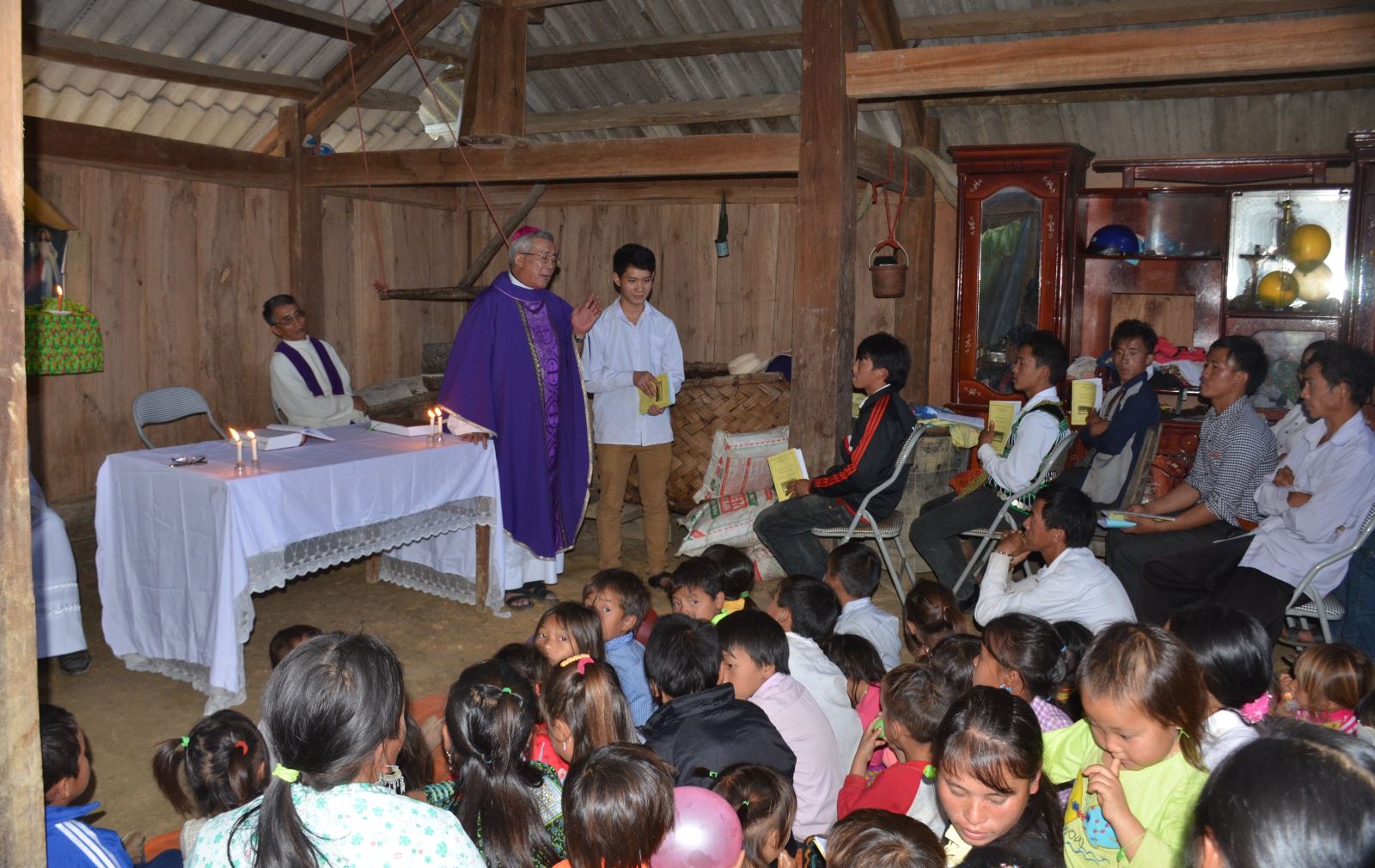Đường lên các bản mùa này ngập chìm trong sương, đã 9 giờ sáng nhưng xe phải bật đèn nếu muốn di chuyển. Cao, lắt lẻo, ngoằn ngoèo, đá lởm chởm… là hình ảnh quen thuộc của những con đường nơi đây. Có đoạn dài chỉ 7 cây số mà mất cả tiếng xe mới qua được. Trên xe, lúc nào cũng có chai cà phê đen pha sẵn. Có lần Đức cha chia sẻ về sở thích uống cà phê, vì những chuyến xe đường dài cần dùng nó chống lại cơn buồn ngủ để đến nơi có tâm trạng tỉnh táo, tư thế thoải mái nhất khi gặp gỡ bà con. Mỗi lần đến, ông cụ tóc bạc mang theo rất nhiều tràng hạt và thuốc bổ tặng người lớn tuổi, còn lũ trẻ xem ngài như ông bụt, vì lúc nào xuất hiện cũng có bánh trái, bong bóng làm quà. Dưới miền xuôi, những thứ đó xem ra quá bình thường, nhưng ở đây lại chính là quà quý đối với những người không được no đủ ngay trong bữa ăn hằng ngày. Người già thì nhận được sự quan tâm, còn trẻ nhỏ lại có niềm vui, sự phấn khích, chờ đợi mà phải lâu lắm mới có được một lần nên ai nấy tay nhận quà, miệng không ngừng cám ơn và quyến luyến không dứt.