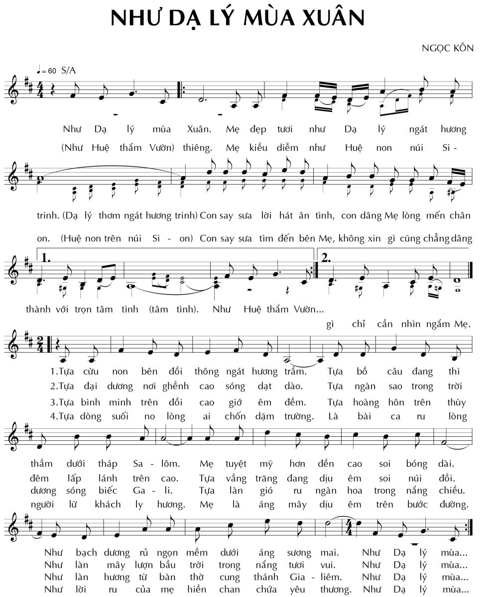 Đã có rất nhiều bài Thánh ca tôn vinh Đức Trinh nữ Maria, thế nhưng những ca khúc viết về Đức Mẹ và Mùa Xuân thì lại còn khá khiêm tốn - trong số đó, ca khúc Như Dạ Lý Mùa Xuân của nhạc sĩ Ngọc Kôn, được coi là đã chạm đến những cung bậc cảm xúc bày tỏ lòng mến yêu đối với Mẹ Thiên Chúa...