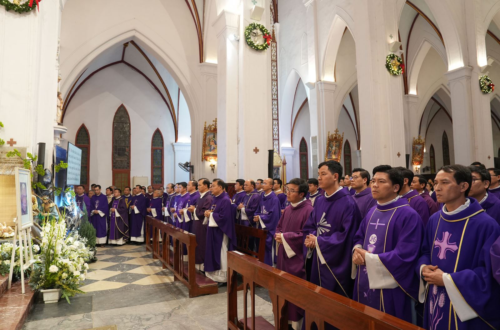 | Linh mục đoàn Tổng Giáo phận Hà Nội hiệp thông trong thánh lễ cầu nguyện cho Đức nguyên Giáo Hoàng Bênêđictô XVI - ảnh: tonggiaophanhanoi.org |