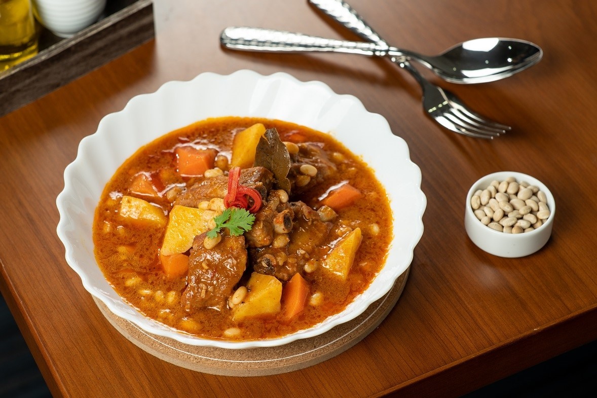 - Cho dầu ăn vào chảo, chiên sơ sườn. Tiếp tục cho hành tây và cà chua vàoxào. Sau đó cho đậu, cà rốt, khoai và nước dùng vào ninh cho đến khi mọi thứ nguyên liệu mềm. Nêm nếm gia vị lại.