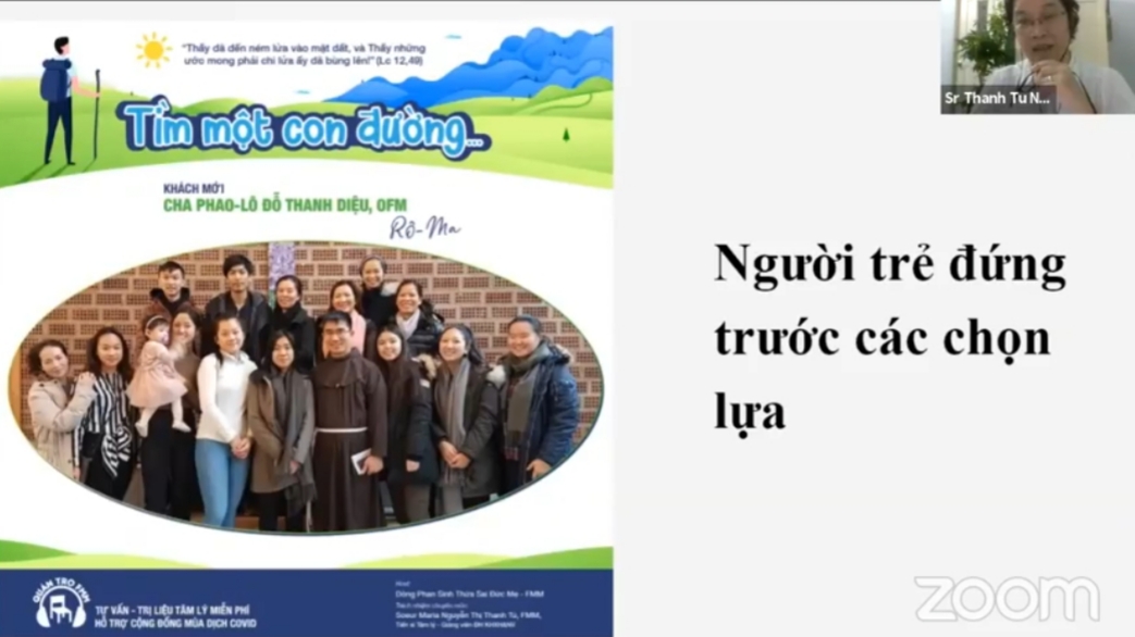 Dâng cả tuổi xuân cho Nước Trời qua việc phục vụ người nghèo ở Kenya châu Phi, sơ Lương Hồng kể cho các bạn trẻ nghe cuộc phiêu lưu của mình nơi miền đất xa lạ, với sự khác biệt về ngôn ngữ, tập tục và văn hóa. Cả “phòng Zoom” lặng thinh nghe sơ nói về hành trình ấn tượng, khó quên khi đi lạc đường, phải tá túc tại một nhà thờ lạ, nơi vốn không tiếp nữ giới. Ban đầu sơ bị người bảo vệ từ chối, nhưng vì trời đã tối, đi đường nguy hiểm, người dân lại được sử dụng súng tự do… nên sơ đành phải nài nỉ một lần nữa. Cuối cùng, sơ cũng được người ta cho ở lại. Qua câu chuyện này, sơ bày tỏ: “Cho dù trong bất kỳ hoàn cảnh nào, chúng ta đừng bỏ cuộc, hãy luôn tìm cách để giải quyết cho bằng được vấn đề, để đạt được mục tiêu ban đầu của mình. Người bảo vệ không cho mình vào, họ làm đúng luật, nhưng có một điều luật cao hơn là luật yêu thương. Ðừng sợ, chúng ta cứ cố hết sức mình, chắc chắn Chúa sẽ nhìn thấy sự nỗ lực của chúng ta và Ngài sẽ chúc lành cho mình”.