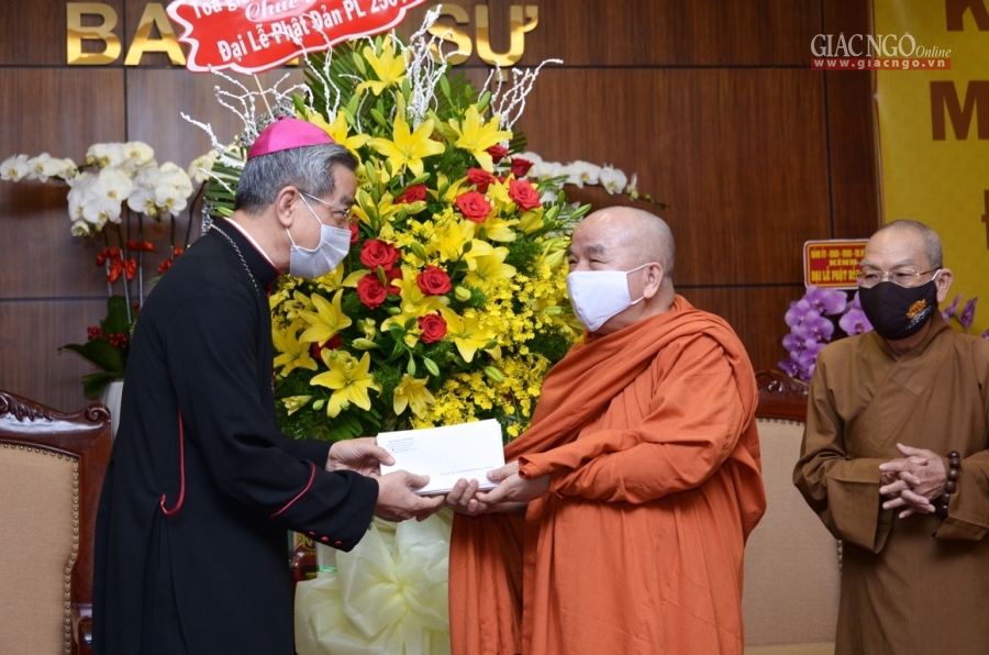 Dịp này, Ðức Tổng Giám mục Giuse Nguyễn Năng đã trao sứ điệp của Hội đồng Tòa Thánh về Ðối thoại Liên tôn gởi cộng đồng Phật tử nhân Ðại lễ Phật đản PL.2564 đến chư tôn đức. Sứ điệp mang tên: “Phật tử và Kitô hữu: xây dựng một nền văn hóa từ bi và huynh đệ”. Ðáp từ, Hòa thượng Thích Thiện Tâm bày tỏ lòng tri ân Ðức Tổng Giám mục, các linh mục Ban Mục vụ, đại diện các dòng tu đã đến thăm và chúc mừng Phật đản. Hòa thượng khẳng định, các buổi thăm viếng giữa đại diện hai tôn giáo là truyền thống tốt đẹp được duy trì hằng năm. Nhiệm vụ của hai tôn giáo là nghĩ đến tình hình của đất nước trong giai đoạn khó khăn phòng chống dịch bệnh, cùng góp phần chăm lo cho đời sống nhân dân, phục vụ cho đạo pháp và dân tộc. “Chúng ta đều chung mục tiêu là làm cho đời sống tín hữu, nhân dân được bình an, phụng sự tận tâm trên tinh thần từ bi, bác ái của hai tôn giáo”, Hòa thượng chia sẻ.