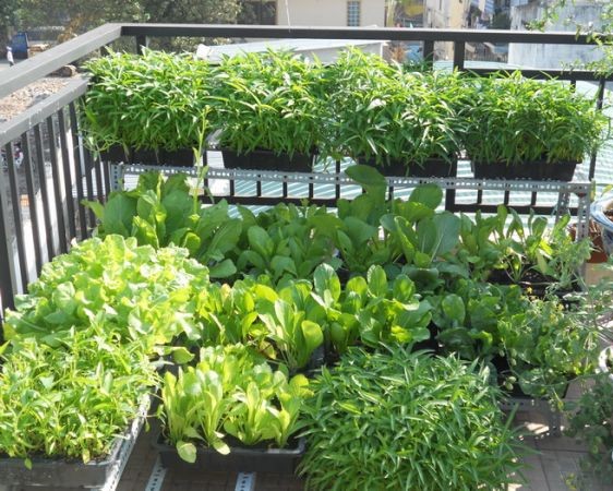 Bà Hồng Hoa, một cán bộ hưu trí ở Hà Đông - Hà Nội, sống trên tầng cao nhất của một chung cư, giới thiệu với bạn bè thân quen một không gian nhỏ có giàn cao trồng rau từng tầng, chỗ giặt giũ cũng trồng được ớt, sả, các loại rau gia vị. Không bao nhiêu nhưng kỳ công và đẹp.