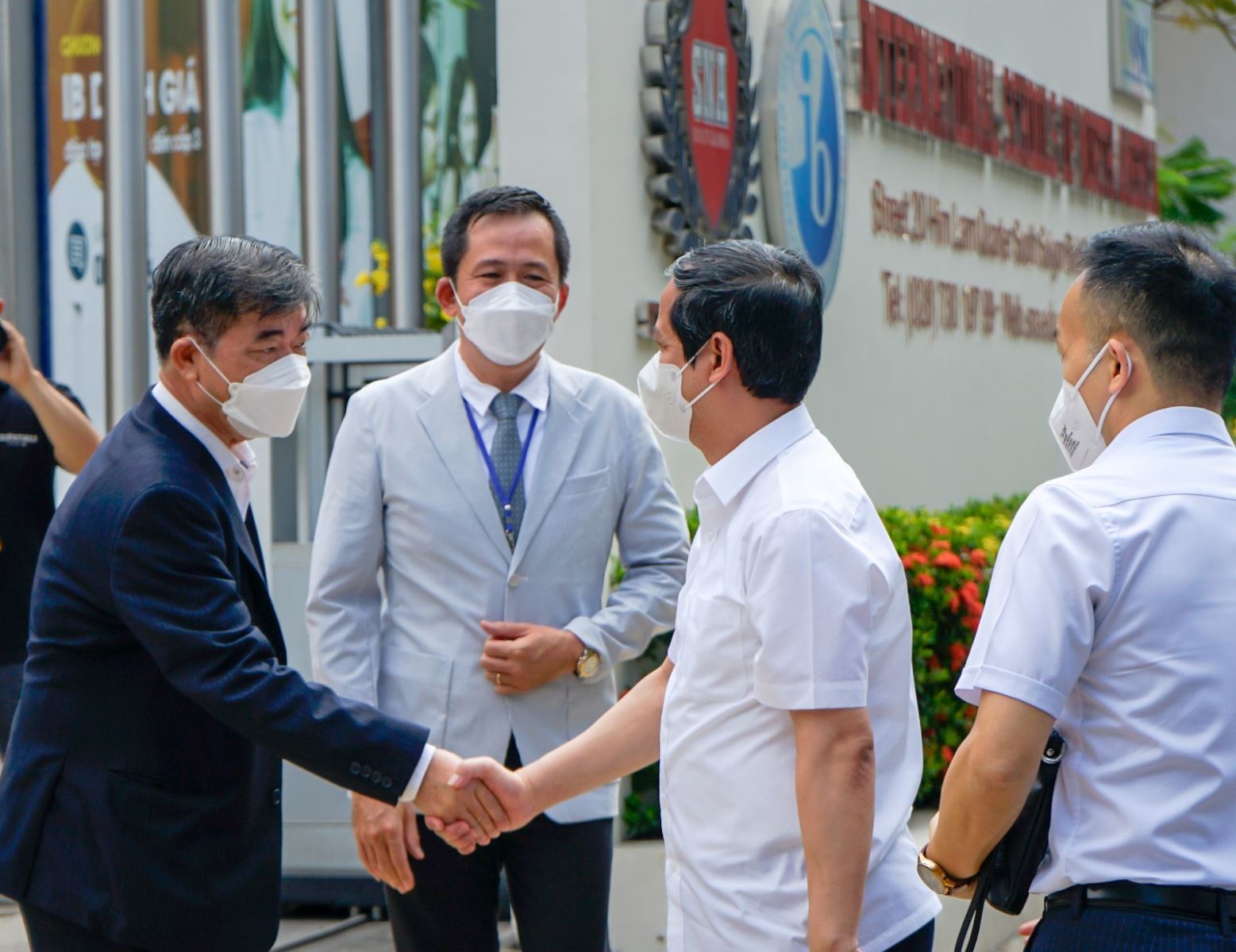 PGS.TS. Thái Bá Cần - Phó Tổng giám đốc Tập đoàn Nguyễn Hoàng chào đón Bộ trưởng cùng Đoàn công tác của Bộ GD&ĐT tới thăm trường SNA