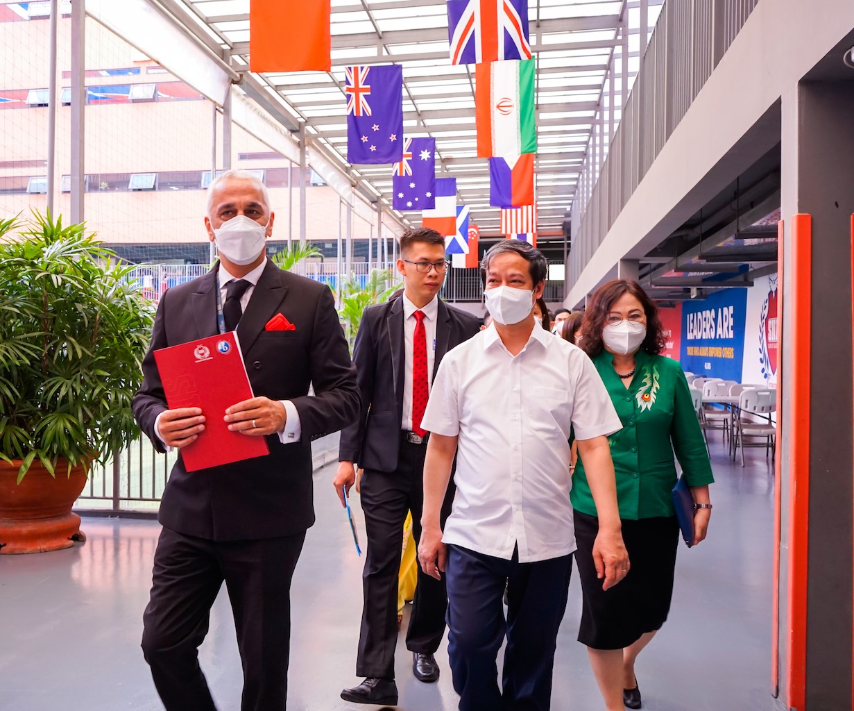 Thầy Mike Miller, hiệu trưởng trường SNA đưa Bộ trưởng Nguyễn Kim Sơn và các đại biểu đi tham quan trường