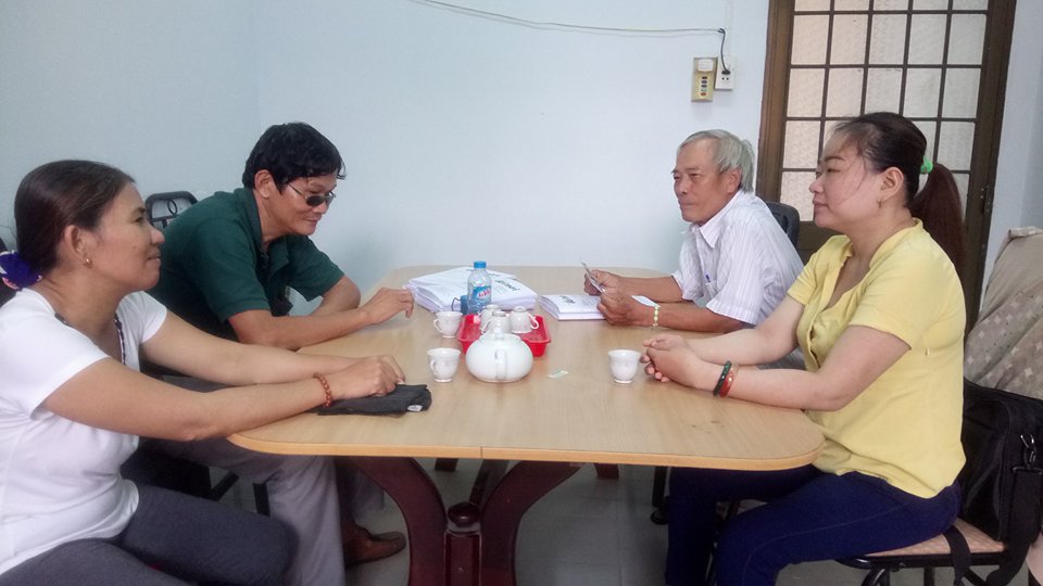 Văn phòng của hội người khiếm thị rộng chừng 4m2, nằm trong khuôn viên Ủy ban nhân dân huyện Củ Chi. Khi chúng tôi đến thăm, căn phòng nhỏ đang rộn rã tiếng nói cười của các thành viên trong hội. Họ ngồi quây quần bên nhau, vừa trò chuyện vừa làm việc riêng. Có người lần giở tờ báo in bằng chữ nổi, người đang dùng điện thoại...; riêng ông Trúc ngồi bàn máy tính xem một số văn bản giấy tờ. Kéo chiếc ghế nhựa mời khách, ông mở từng tấm hình lưu lại trong máy tính về các hoạt động của hội, rồi kể cho chúng tôi nghe mối duyên với người khiếm thị.