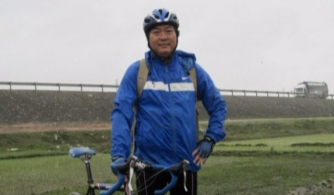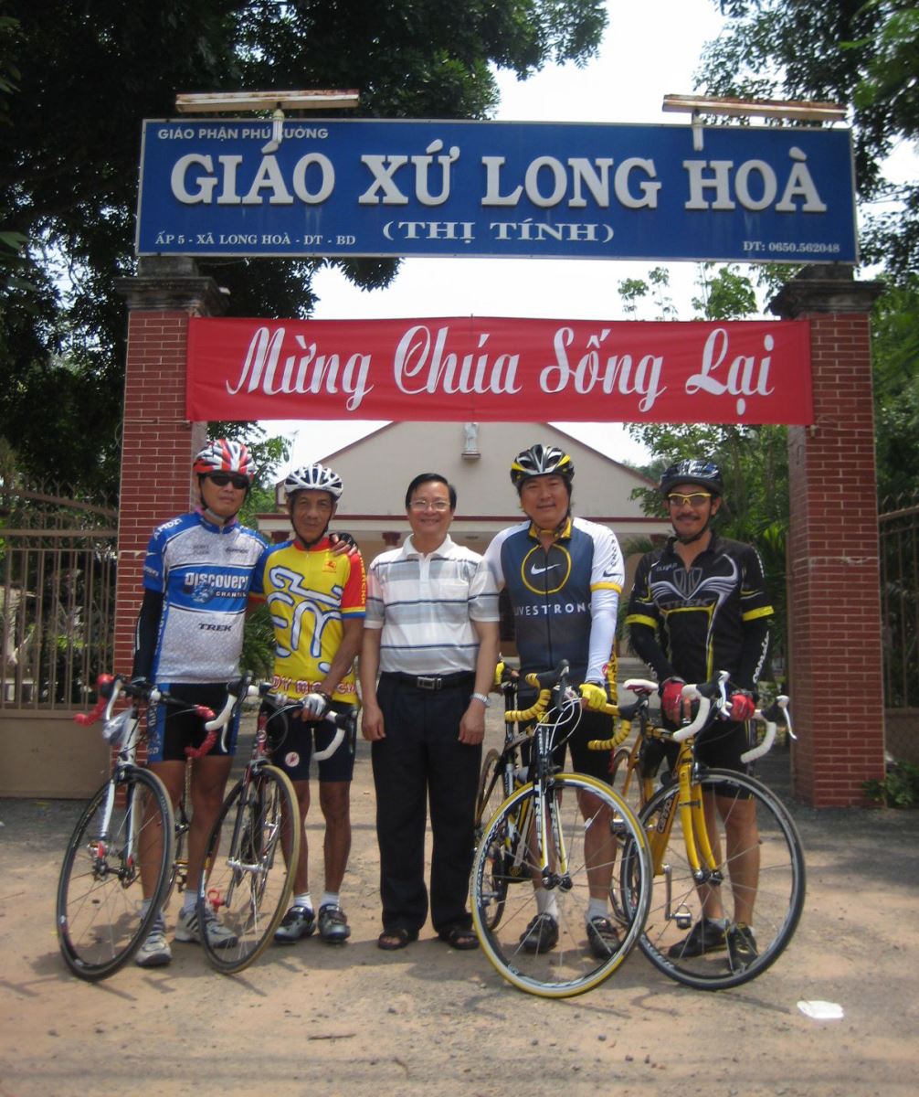 | Nhóm xe đạp do ông Trạch thành lập đến thăm giáo xứ Long Hòa (giáo phận Phú Cường) |