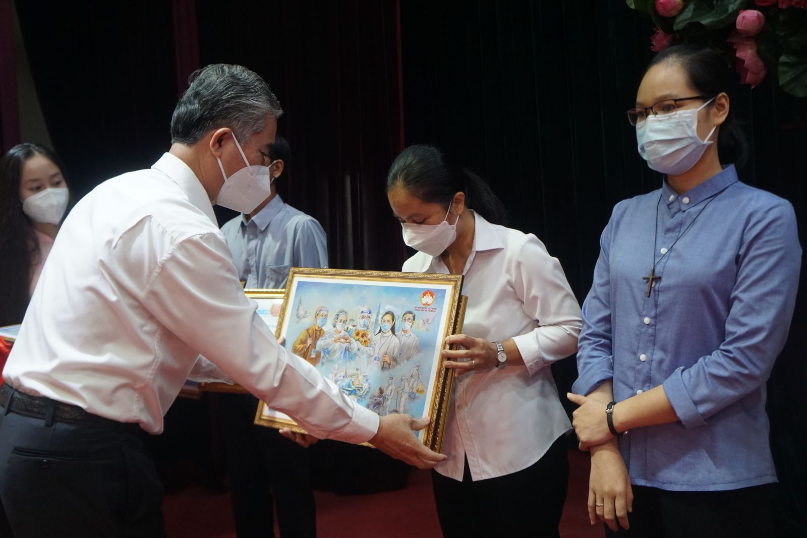 Cuối chương trình, ban tổ chức gởi tặng đại diện 99 cơ sở tôn giáo đã vận động TNV tham gia hỗ trợ các bệnh viện điều trị Covid-19 bức tranh “Những bông hoa trong tuyến đầu chống dịch” của họa sĩ Lê Sa Long để thể hiện sự tri ân những đóng góp của các thiện nguyện viên tôn giáo trong cuộc chiến chống SARS-CoV-2.