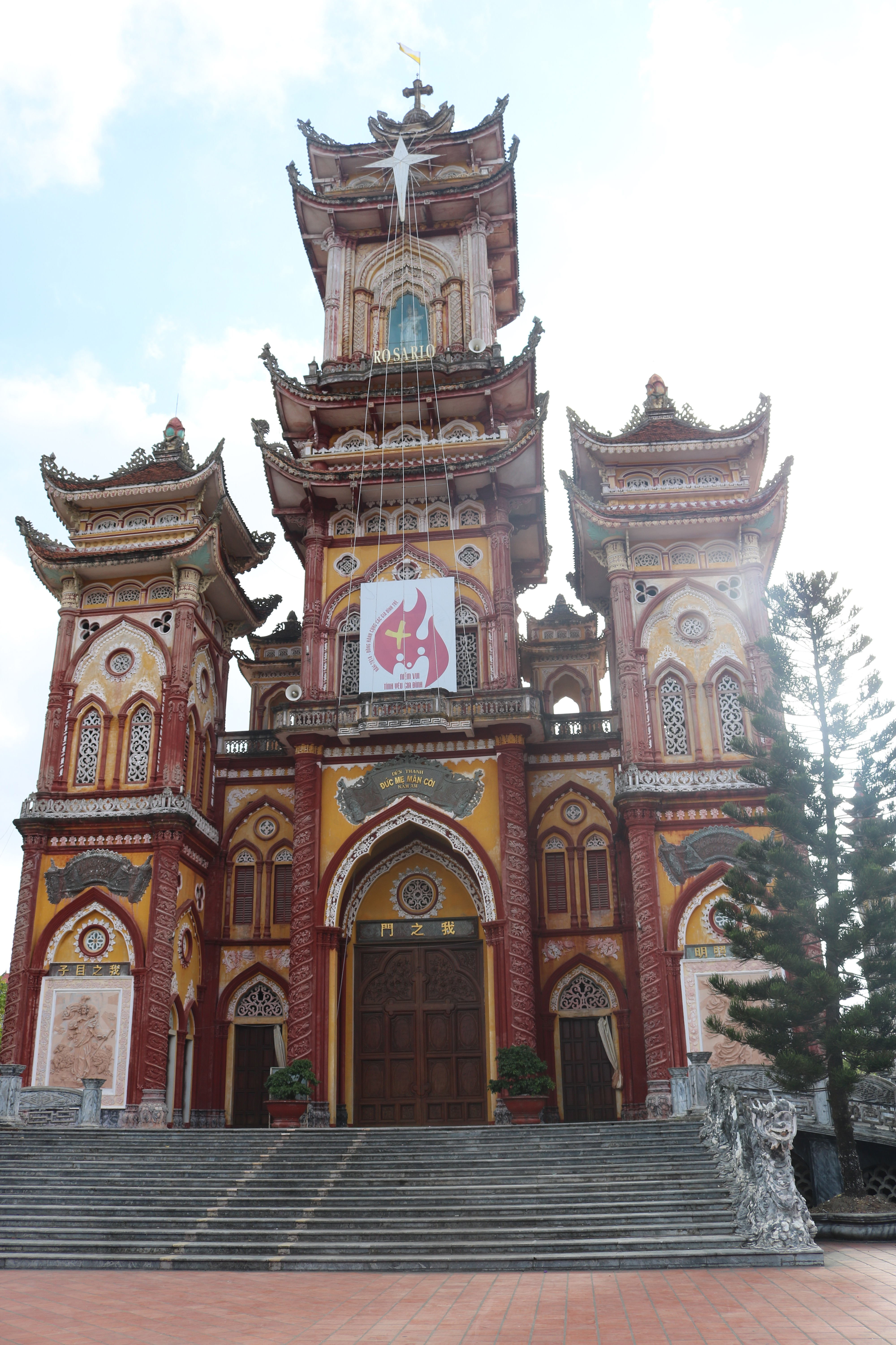 Mặt tiền nhà thờ là ba tháp chuông với tháp chính 50m và hai tháp phụ 28m có 8 mái cổ xếp tầng, cao vút được trang trí bằng những bức họa, những biểu tượng quen thuộc như quả bầu, hoa sen, cành nho, bông lúa... Cung thánh được chia làm 3 gian, chạm khắc họa tiết Việt, sơn son thiếp vàng lộng lẫy. Trung tâm gian thánh là các tòa vàng, mỗi bên có những tháp bút, bút đồng, phía trước là những cửa võng với đường chông, đường lá lật, lá quả nho đan xen, dát vàng. Nhìn lên phần mái chồng diêm hai bên sẽ thấy ngoài lớp cửa chớp lấy sáng là 5 mầu nhiệm kinh Mân Côi được thể hiện trên những tấm kính màu. Ngoài ra còn rất nhiều chi tiết khác dẫu to lớn hay vô cùng nhỏ bé nhưng đều được những người thợ thủ công chăm chút tỉ mỉ như gởi vào đó vô vàn tâm tình, lời nguyện cầu dâng lên Thiên Chúa và Mẹ Maria. Ðoàn thi công khi ấy có nhiều thợ mộc, thợ nề là con cái Nam Am với người đứng đầu là ông Giuse Khổng Trung Mạnh, đã dồn hết tâm sức để xây dựng nhà thờ vững chắc, tạo tạc từng nét hoa văn tinh tế hầu làm nên một tổng thể đồ sộ, tráng lệ.