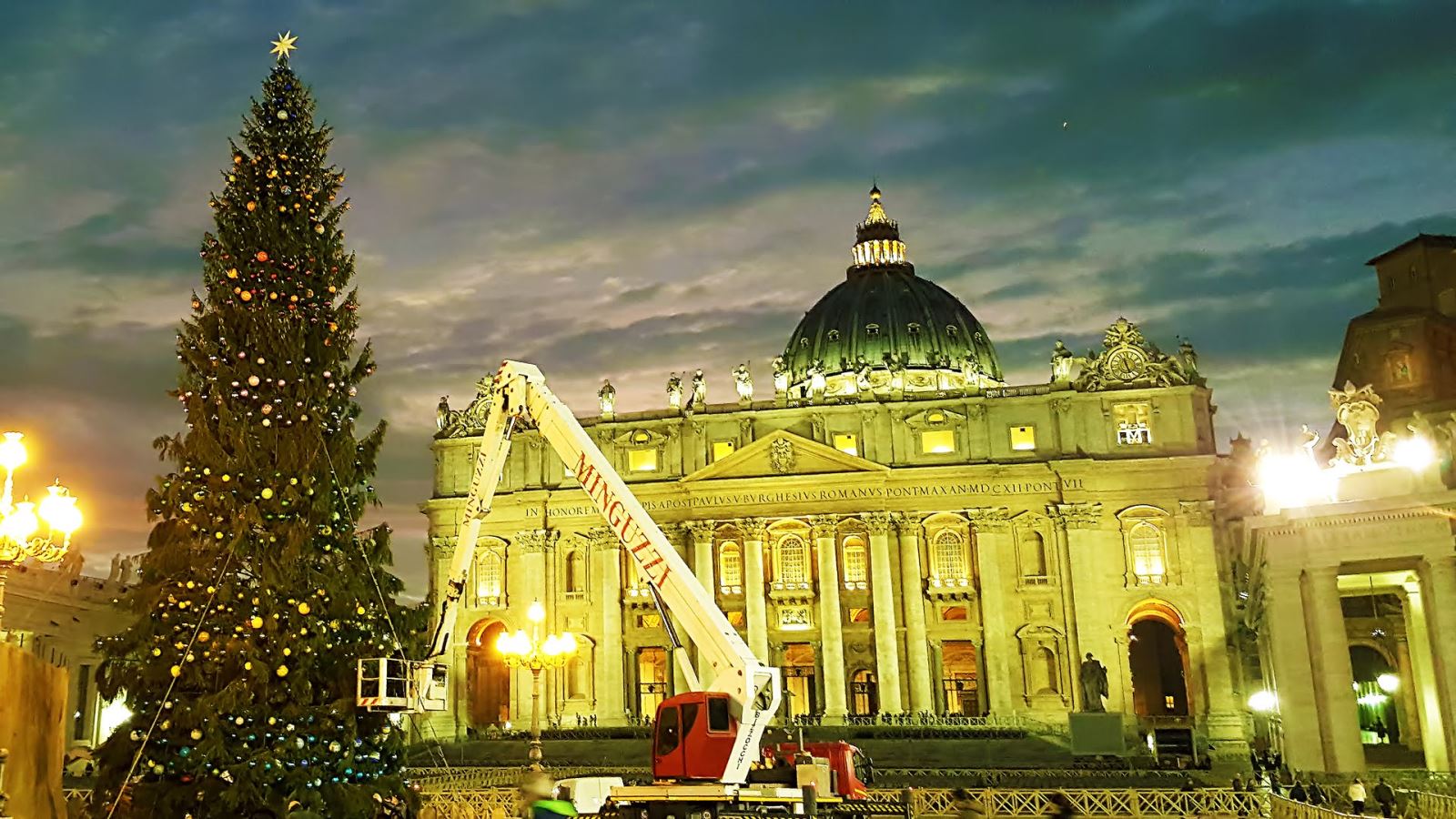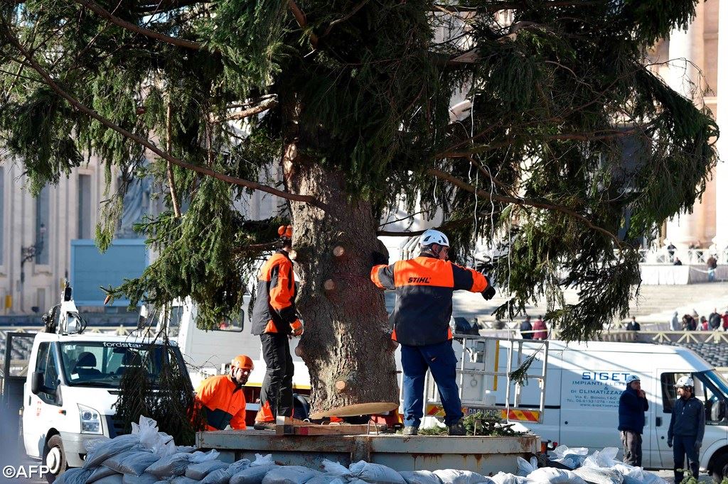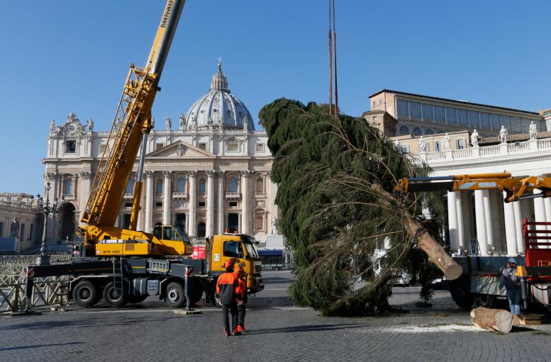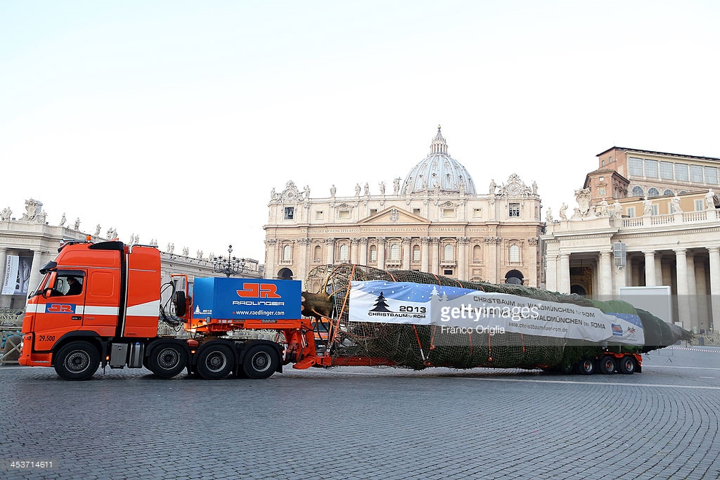 Cây thông Giáng Sinh đã đến Quảng trường Thánh Phêrô sau 12 ngày đêm băng qua khắp Châu Âu. Đây là món quà từ Tổng giáo phận Elk của Ba Lan. Cây cao khoảng 27m, nặng 7 tấn, đến từ một vùng nổi tiếng về các loại cây và hồ nước.