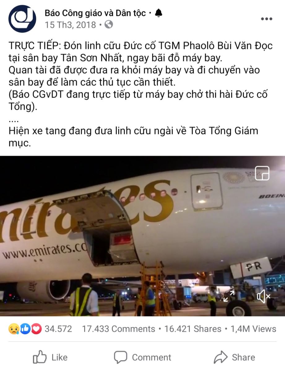 Tối ngày 15.3.2018 trang Fanpage của báo livestream (phát trực tiếp) độc quyền sự kiện đón linh cữu Ðức cố Tổng Giám mục Phaolô Bùi Văn Ðọc tại sân bay Tân Sơn Nhất. Sự kiện này thu hút hàng trăm ngàn người xem trực tiếp và để lại bình luận. Nhiều trang web chính thống của các giáo phận và của các cá nhân người Công giáo và cả ngoại giáo cũng chia sẻ phát lại. Ðây là ưu điểm lớn của Fanpage mà báo giấy và trang website không có. Cũng từ sự kiện này mà nhiều độc giả biết đến và quan tâm theo dõi trang. Chị Nguyễn Thị Thu Hương (Gx Tân Hương, TGP TPHCM) hồi tưởng: “Năm đó, thông tin Ðức cố Tổng Phaolô đột ngột mất tại Rome khiến gia đình mình vô cùng bất ngờ. Ai cũng buồn. Mình muốn biết khi nào ngài được đưa về Việt Nam để đến viếng, nên lên mạng tìm kiếm thông tin. Ðược biết hành trình đưa thi hài ngài về nước cũng không phải dễ dàng. Mãi 8 ngày sau khi mất ngài mới về đến Tòa Giám mục. Mình có đến viếng nhưng vì quá đông nên không thể vào trong được. Lúc này ai cũng nôn nóng được xem thấy những hình ảnh đầu tiên của ngài tại sân bay; tìm kiếm trên mạng thì hầu như chưa có. Mãi sau mới thấy một người bạn chia sẻ livestream đón linh cữu Ðức cố Tổng tại sân bay của báo CGvDT trên Facebook; mình mới vào xem và chia sẻ đường link cho người thân ở nhà. Thời điểm này mình chưa theo dõi trang, nhờ sự kiện này mà mình mới biết”. Qua sự kiện này, lượt người thích và theo dõi trang Fanpage báo CGvDT tăng một cách đáng kể.