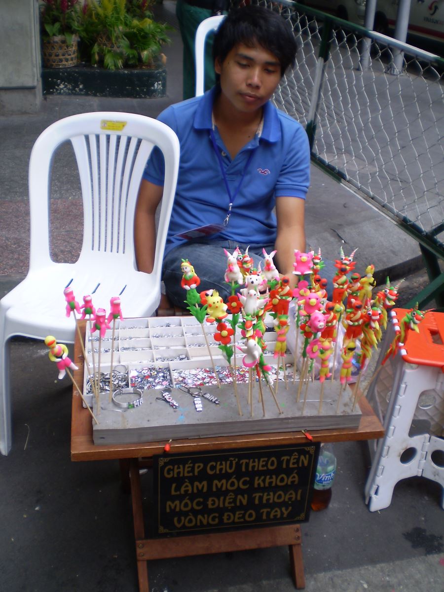 Anh Phạm Văn Thế mưu sinh với gian hàng bán tò he và móc khóa để nuôi con ăn học