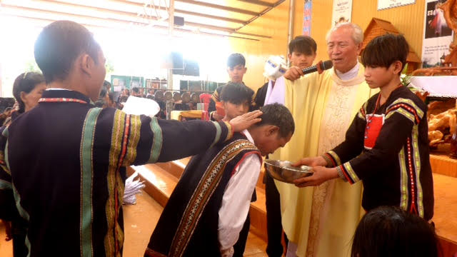 Cha Giuse Trần Sỹ Tín rửa tội cho người J’rai trong dịp Phục sinh tháng Tư năm 2016 |