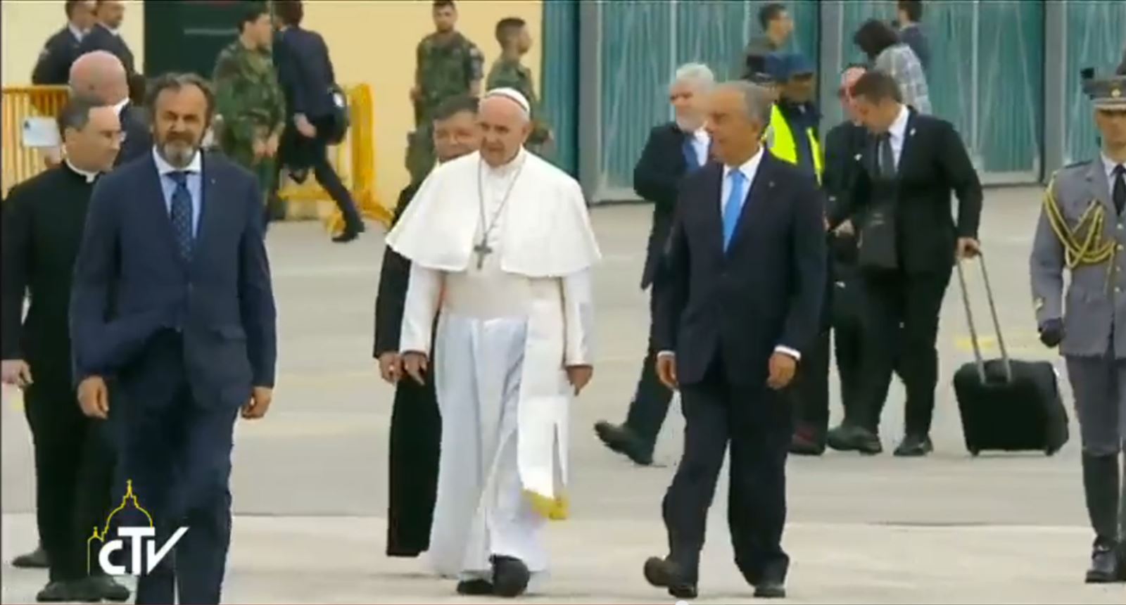 Khoảng 16 giờ ngày 12.5 (22 giờ, giờ VN) chuyên cơ chở Đức Giáo hoàng đáp xuống sân bay Monte Real, phía bắc thủ đô Lisbon. Ngài được Tổng thống Bồ Đào Nha Marcelo Rebelo de Sousa đón tiếp nồng nhiệp và đã có cuộc hội kiến riêng với vị nguyên thủ này. Tiếp đến, Đức Phanxicô được trực thăng đưa đến Fatima vào 18 giờ (0 giờ ngày 13.5, giờ VN). Trực thăng đã dừng rất lâu phía trên quảng trường của Đền Thánh để hàng trăm ngàn tín hữu có thể vẫy chào ngài. Đức Thánh Cha đã cầu nguyện ở Nhà nguyện được xây tại nơi mà cách đây 100 năm, Đức Mẹ đã hiện ra. Ngài đặt một nhánh hồng cạnh Đức Mẹ Fatima và dâng lên Mẹ “cuộc hành hương của niềm hy vọng và hòa bình”.