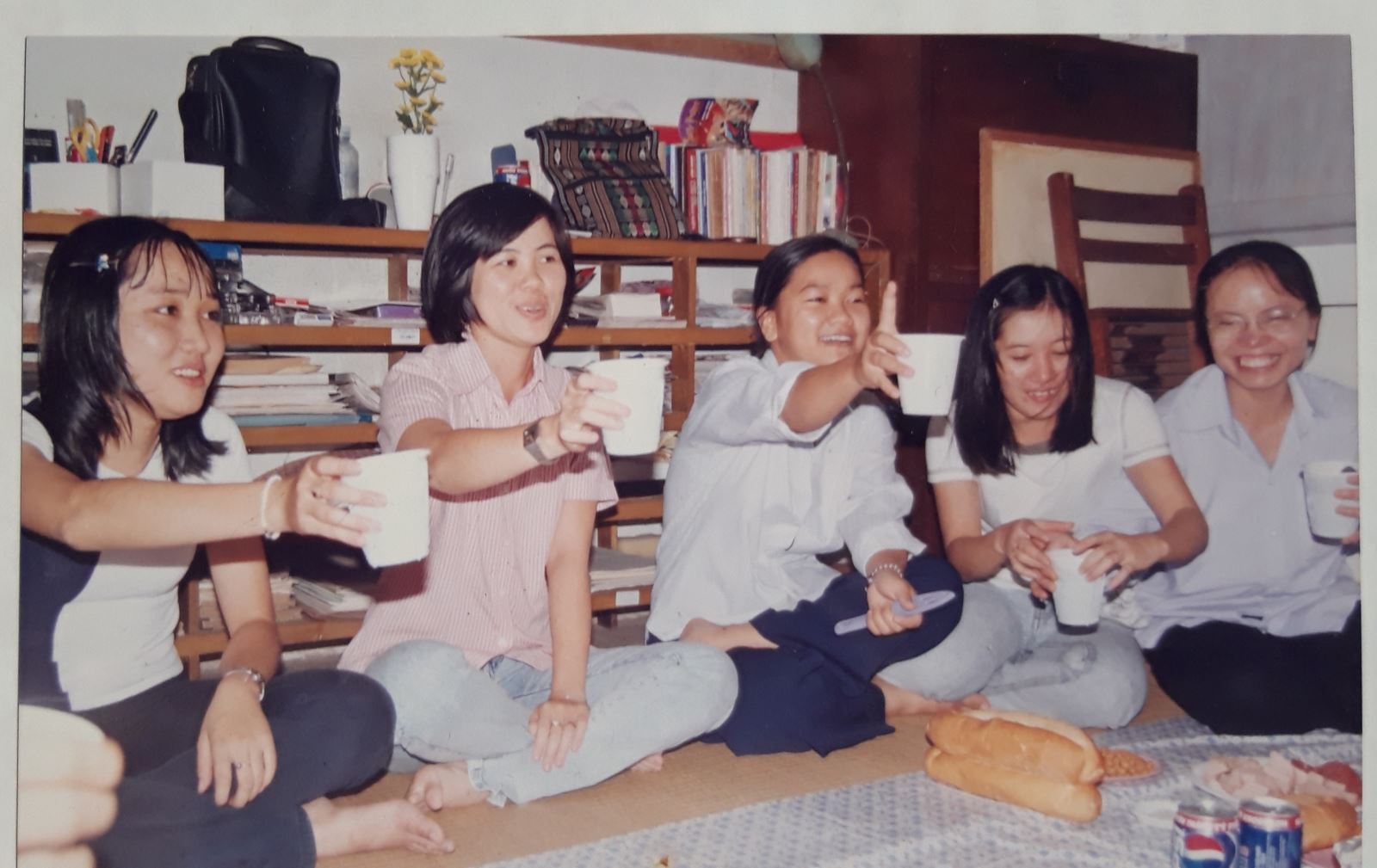 Cô sinh viên Lê Duy Thủy (ngồi bìa trái) và Kiều Thu (thứ ba từ phải sang) cùng một số thành viên nhóm Bạn Trẻ trong một bữa ăn mừng Giáng Sinh năm 2000 tại phòng Bạn Trẻ của báo CGvDT |