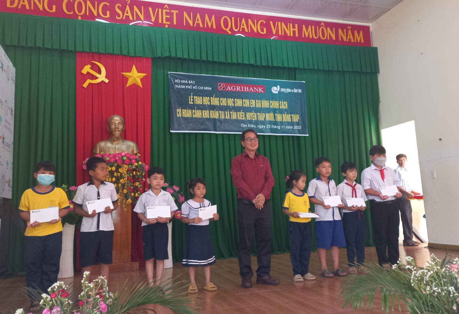 Sáng 25.11.2022, tại Trung tâm Văn hóa Học tập Cộng đồng xã Tân Kiều của huyện Tháp Mười, tỉnh Ðồng Tháp, các em học sinh thuộc các khối lớp của Trường Tiểu học Tân Kiều 1, Tân Kiều 3 và THCS Tân Kiều có hoàn cảnh khó khăn đã được Báo Công giáo và Dân tộc trao 150 suất học bổng (mỗi suất 1.000.000 đồng).