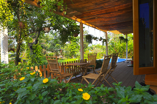 Ông chủ quán yêu thiên nhiên, thích cảnh thanh bình của chốn làng quê nên đã dùng đôi tay nghệ sĩ của mình để vẽ nên điều ấy. Và bức tranh nông thôn đã hiện ra. Bên trái của khuôn viên quán, ông xây một hồ cá nhỏ, thả bèo, rong, và các loài thực vật thủy sinh khác. Mỗi ngày, ông tận dụng những mẩu bánh mì mà khách ăn thừa để rải xuống cho các chú cá bé nhỏ. Rồi ông trồng các loại rau dễ sống quanh những chậu hoa như càng cua, diếp cá, quế... Phía sau vườn cây, ông trồng thêm nhiều loại rau sạch để bảo vệ sức khỏe trên bàn ăn gia đình. Ông còn nuôi vài chú gà tre sặc sỡ, thả lan quanh nhà cổ. Chỉ một thời gian ngắn, lũ gà tre sinh thêm con cháu. Thành viên trong nông trang còn có mấy chú chó, cô mèo rất đáng yêu. Thường ngày dù bận công việc cơ quan nhưng ông vẫn tranh thủ về chăm sóc nông trang của mình... Thỉnh thoảng người ta thấy ông dẫn chó ra sau hè bắt ve, tắm mèo, dội chuồng gà, hái rau như một người nhà quê chính hiệu!