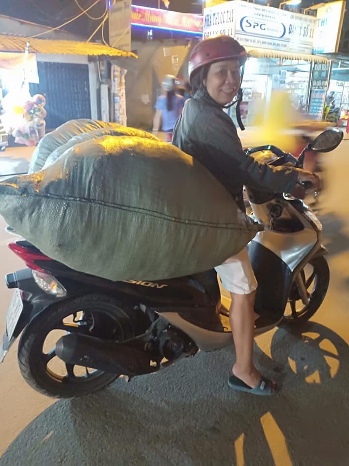 “Từ ngày mở gian hàng này, cổ cứ đi tới đi lui xin đồ về cho người nghèo, bao đồ phía sau còn bự hơn cả người cổ” |