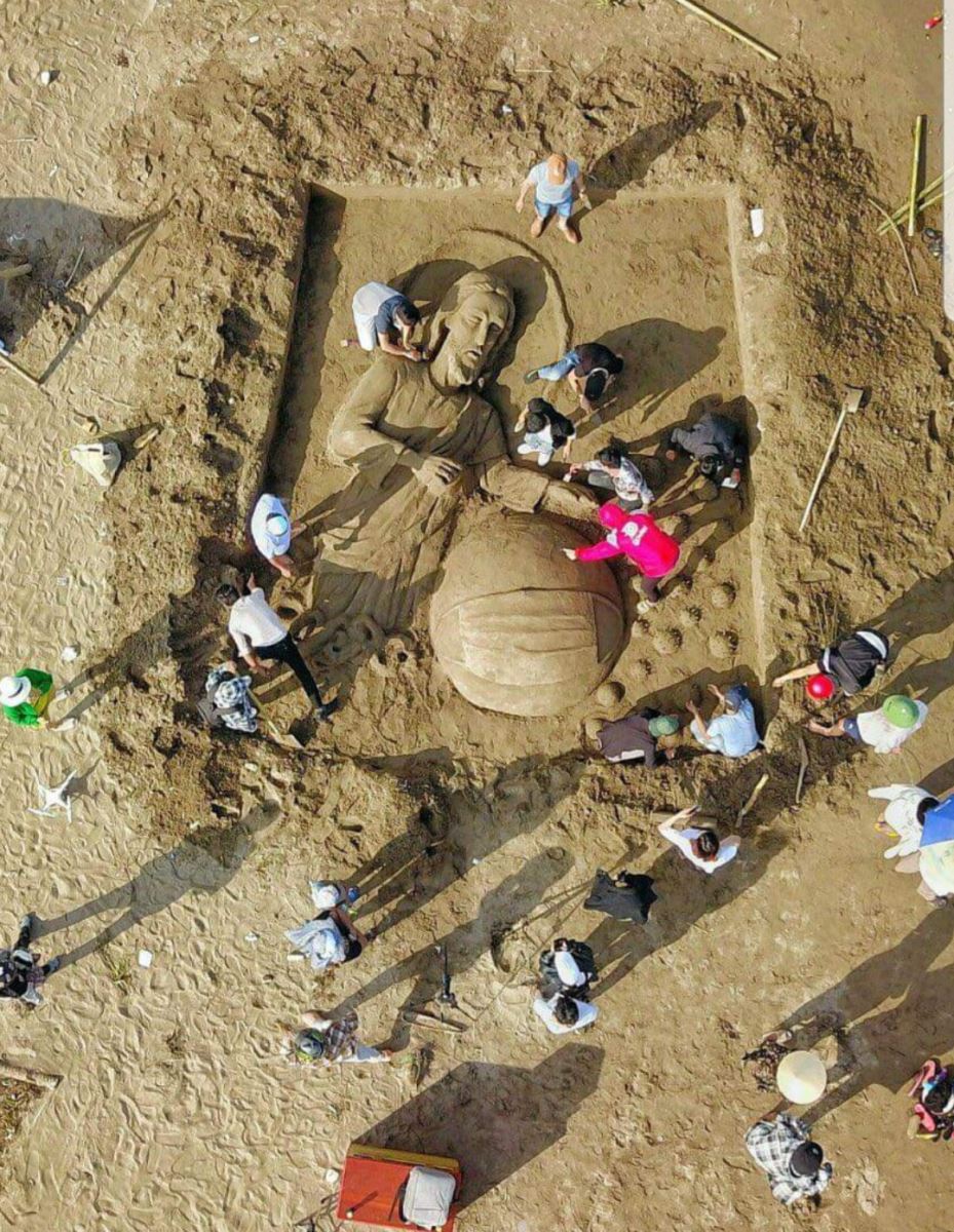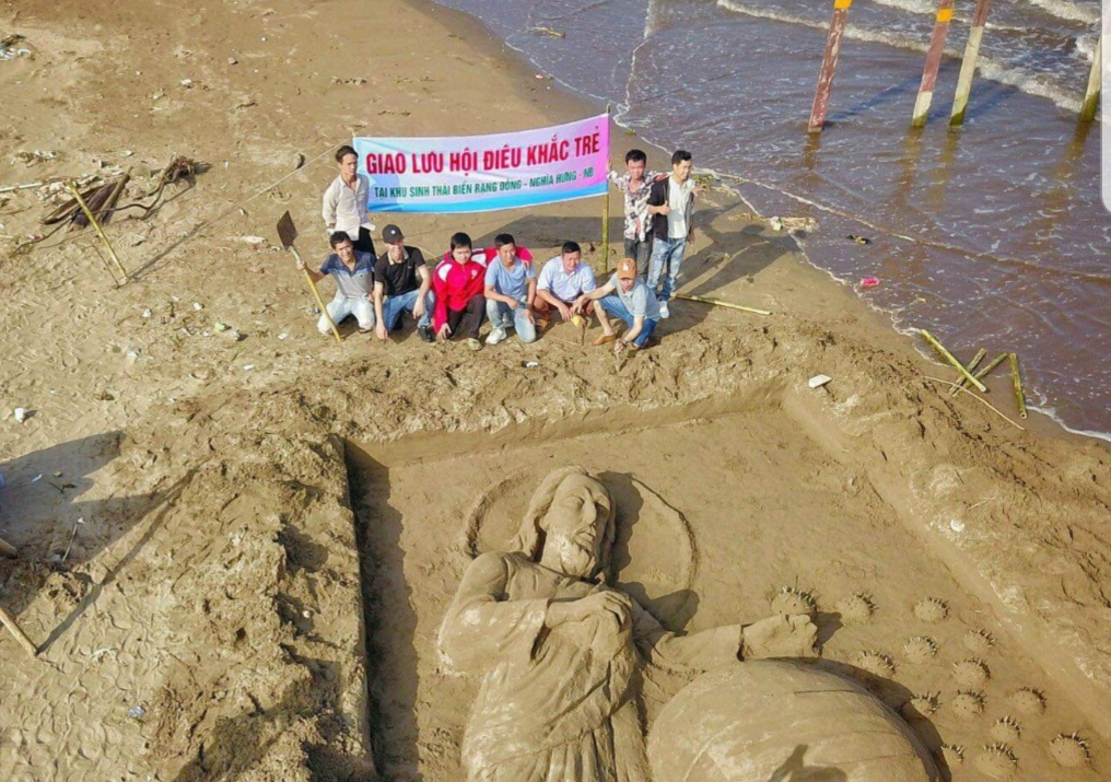 Quay trở lại bãi biển khu sinh thái Rạng Ðông (Nam Ðịnh) năm nay, những chàng trai đam mê điêu khắc thuộc hai giáo xứ Quỹ Nhất và Xuân Trường đã cùng nhau tạo nên tác phẩm độc đáo trên cát “Chúa tạo dựng vũ trụ”, với mong ước Chúa sẽ che chở cho thế giới khỏi đại dịch Covid-19.
