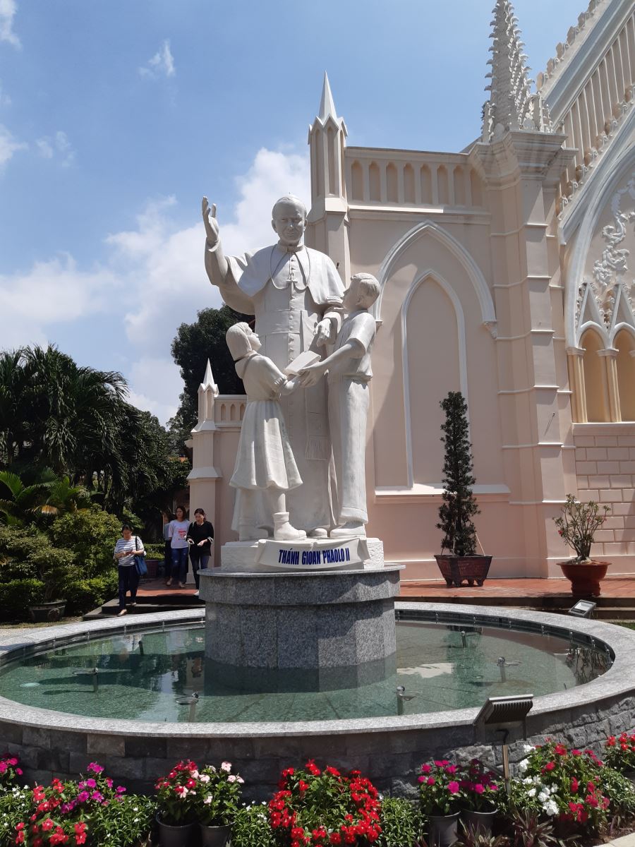 Trước khi bắt đầu thánh lễ, Ðức Hồng y G.B Phạm Minh Mẫn đã chủ sự nghi thức làm phép tượng thánh Gioan Phaolô II trước nhà nguyện cổ. Trong phần giảng lễ, Ðức cha Phêrô Nguyễn Văn Khảm chia sẻ về sự gắn kết ba chiều kích tri thức, thiêng liêng và mục vụ nơi con người và hoạt động tông đồ của thánh Giáo Hoàng: “Người ta nhìn nhận ngài là một nhà trí thức tầm cỡ của thế kỷ 20. Làm giáo sư từ khi còn là linh mục; làm Giám mục, ngài vẫn tiếp tục dạy học; khi làm Tổng Giám mục, ngài vẫn thường xuyên tổ chức các buổi gặp gỡ với trí thức; được bầu chọn làm Giáo Hoàng, ngài ban hành rất nhiều thông điệp”. Vị chủ chăn giáo phận Mỹ Tho từng có thời gian phục vụ tại TGP TPHCM tiếp tục trình bày về cuộc đời của vị thánh bổn mạng. Ngài nói thánh nhân có nhiều sáng kiến về mục vụ giới trẻ, gia đình, lòng Chúa thương xót và đối thoại liên tôn. Khi còn là thanh niên, Ðức Gioan Phaolô II đã tham gia vào hội Mân Côi sống. Ngài có khuynh hướng nội tâm rất sâu nên được gọi là con người cầu nguyện. Ba chiều kích đó gắn kết, hòa quyện với nhau nên một, làm cho hoạt động mục vụ của ngài không chỉ diễn ra trên bề rộng nhưng còn có chiều sâu của tri thức và chiều cao của đời sống thiêng liêng. Tất cả làm nên một tổng thể vững chắc, sâu sắc, mang lại hoa trái lâu dài vững bền.