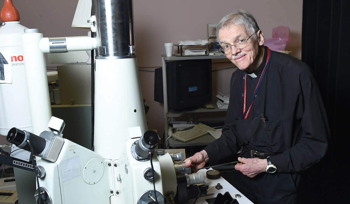 Khi bước vào bên trong văn phòng của cha Andrew Buechele, chuyên gia đang làm việc tại Phòng thí nghiệm Vitreous cấp bang (VSL), bạn sẽ thấy cơ man nào sách và báo cáo, cho thấy sự nghiệp nghiên cứu lâu dài của ngài. Cha Buechele (dòng Linh mục Piarist) đã làm việc và giảng dạy tại phòng thí nghiệm suốt hơn 30 năm qua, nhưng mối liên hệ của ngài với Ðại học Công giáo Mỹ, tọa lạc tại thủ đô Washington D.C của Mỹ, thậm chí còn lâu hơn nữa. Khi còn là chủng sinh trẻ, cha Buechele nghiên cứu triết học và có bằng đại học ngành vật lý tại đại học này vào năm 1967.