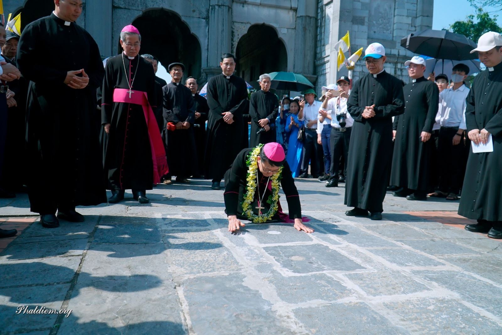 Đến sân nhà thờ Chánh tòa, vị giám mục tân cử đã hôn đất, rồi tiến vào nhà thờ hôn kính Thánh Giá và thinh lặng cầu nguyện trong giây lát.